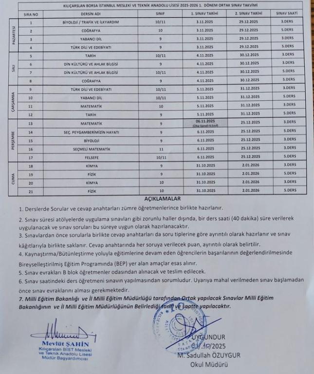 2025-2026 Eğitim öğretim yılı Eylül ayı sorumluluk sınav takvimi.